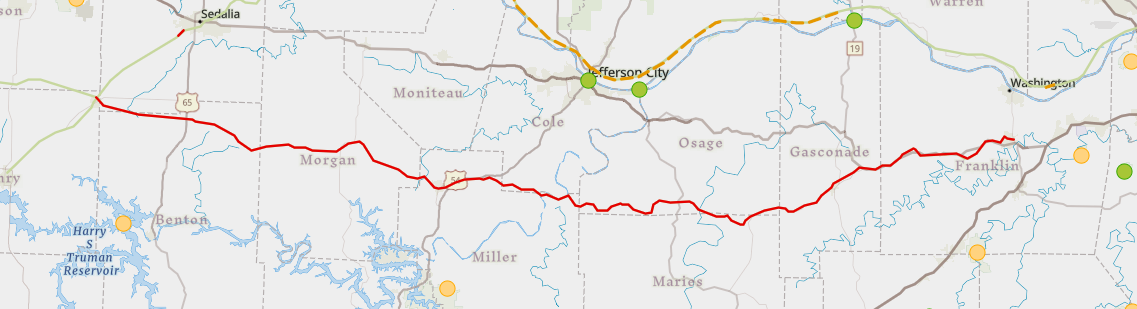 At this point, it is not a complete loop. It is about 11 miles by road from the RIT in Union to the KT at Dutzow.