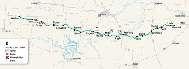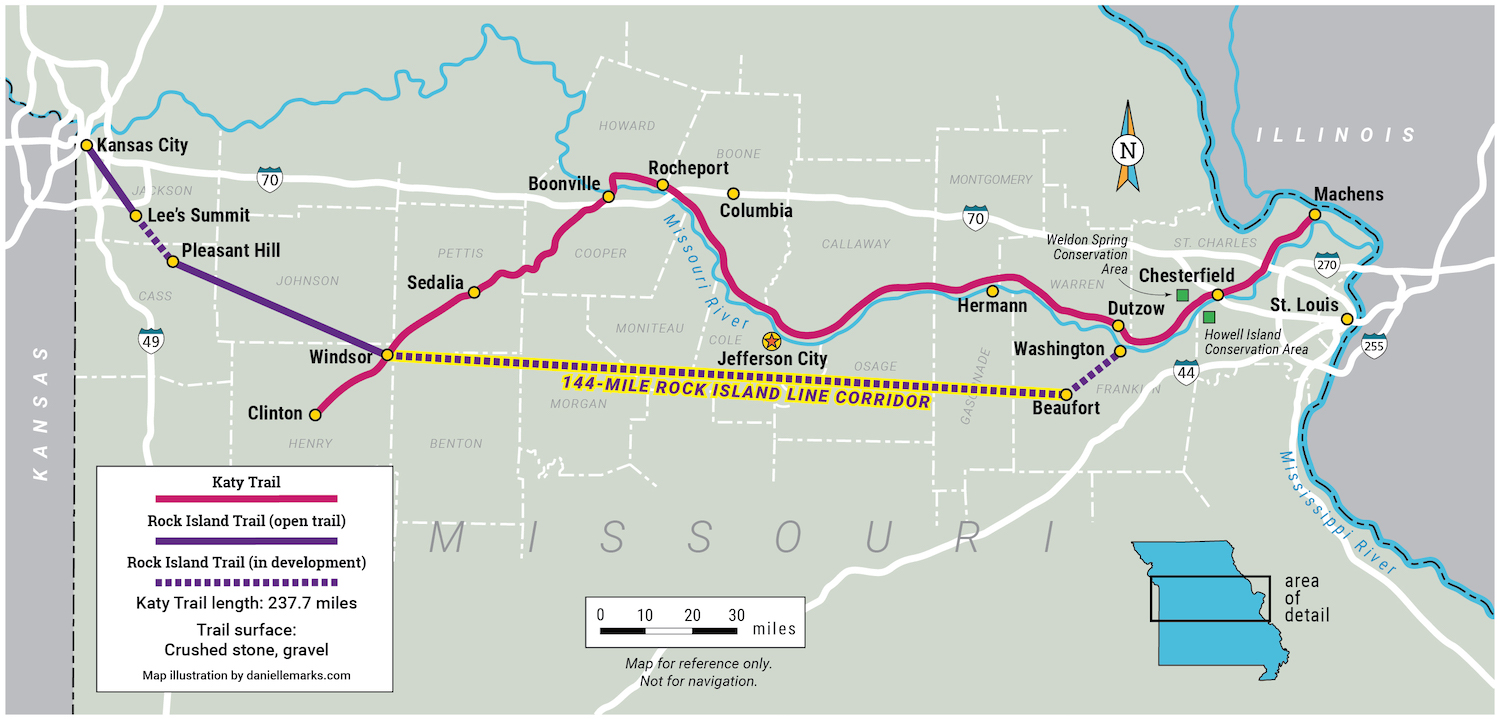 The Rock Island Spur of the Katy Trail spans most of the distance beteen Kansas City and Windsor. I have ridden this.